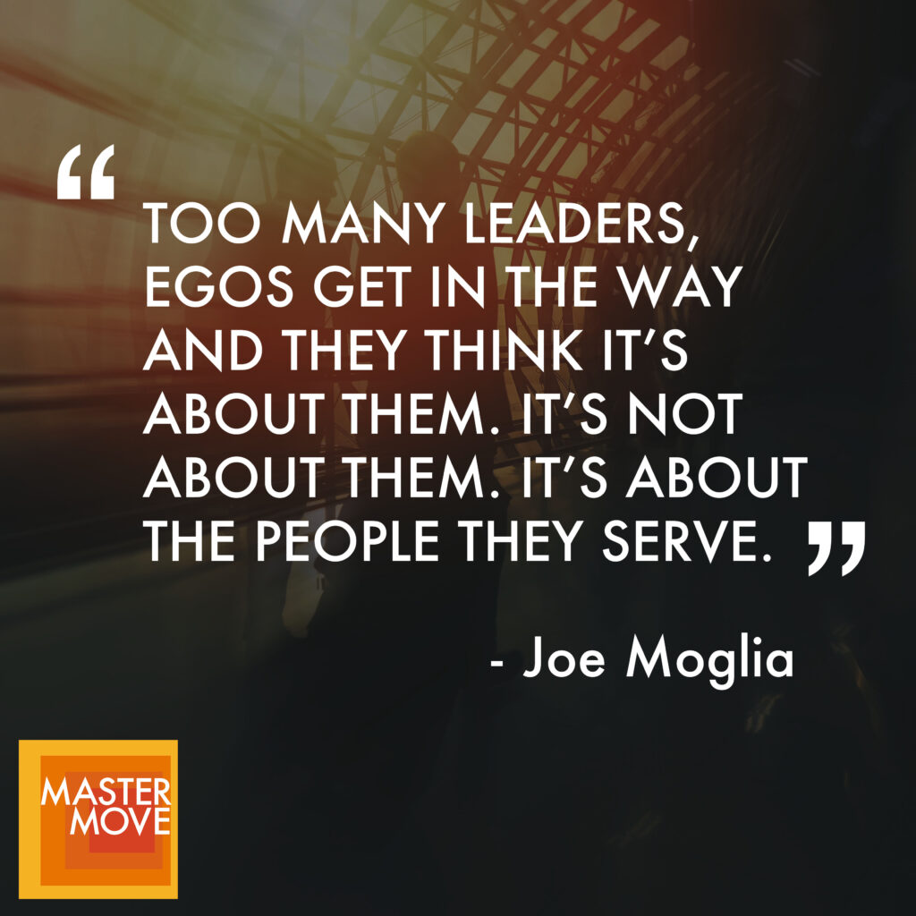 >> Joe Moglia: Just basic, human genetics, right? We come back to everybody wants to be happy, everybody wants to be healthy. Everybody wants to have a little bit better life. They want to produce, be able to provide for the family. That’s everybody. So you begin with that. And, but then with people that you’re working more directly with your, your executive team or people that are going to work for you, well, you got to get to know them. You really don’t know how good they’re going to be or whether or not they’re going to be good until really you’ve had a chance to see them under real stress or under real pressure. So you’ve got to take the time to be able to get, to get to know them. What is it that really matters to them? I don’t necessarily have to know their family, but I kind of want to know if they’re family people. I want to know what are their aspirations. How, how is what you want to be, Craig, on your podcast as a leader different from what somebody else might want to be? So you need. You need to understand that, and you need to be able to make sure they have a job that they are cut out for. But also that job fits their skill sets, and it kind of meets their needs, what they want to be able to do. Then. Then. Then they have the ability. Then they increase the probability they’re going to match their potential. So then, then you live up to bam. Go back to bam. The principle spirit, sounds, courage, love. Love. You’re responsible for that. You know, you’re supposed to have their best interest at stake. Now they’re executives, too, so they’re supposed to have the best interest of the rest of the company, and they’re people at stake. So you create this thing that just compounds on itself, and it becomes an incredible competitive advantage. I would say bam. For me, over five decades in the, in the world of football, or academia or the world of. Of business has been my single competitive advantage.