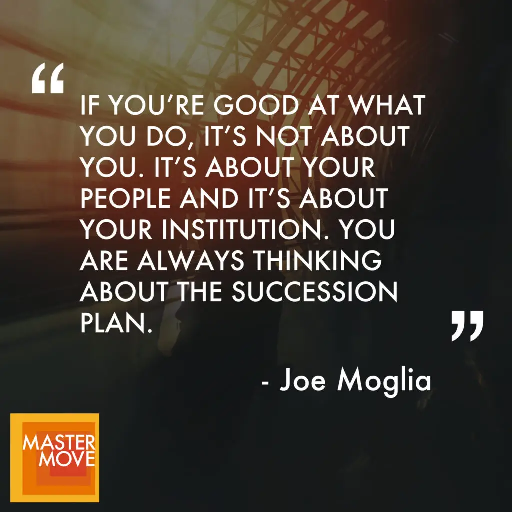 >> Joe Moglia: Yes. So there again a couple parts to this question as well and that is, so remember, BAM is all about accountability. So if you are a family run business, you have a lot of leeway in terms of making decisions that you believe are the best interest of the family. It’s a family business. Even if you happen to have some investors, but you happen to have some investors, well, you got to at least consider them. But they recognize the family owns the vast majority of stock. It’s about the family, period. All right. Now. But once you go public, which is what Ameritrade did, is m. You’re no longer a family business. You have a far greater responsibility to your sherholders and the public to do what is the best thing for the all the sherholders, not just that particular family. So if you’re willing to take the public’s money, then you got to be willing to give up some of that control and recognize it’s no longer about the family, now it’s about the overall institution and its long term growth and the benefit to all the shareholders. So as you make decisions, you make decisions based on your responsibility. I ran a public company, therefore my responsibility was to the public and to all of our shareholders, not just the family. So in terms of, how do you approach then in terms of you want a lasting legacy? at the end of the day, to me it’s always about the people and it’s always about succession planning. If you’re good at what you do, again, it’s not about you, it’s about your people and it’s about your institution, you are always thinking about succession plan. And I think we do in general, I think at academia, we don’t do a good enough job paying attention to this. I think in the real world of business, we don’t do a good job, good enough job paying attention to this. Politics, kind of forget about it all together. With regards to. So. So I’ve got to assume that at some point I, or whoever are leading my respective businesses and divisions are no longer going to be there. And then we’ve got to be prepared so things continue on. If you’ve done a good job, your company should be on your team, should be on that, that, that, that type of path. How are you going to continue on that type of path? You do it by having the right people in place to be able to take over. Now, they can adjust, they can adapt, and that’s the board’s number one responsibility. How do you hire the right leader for your particular institution? We literally just went through this process hiring a new president at Coast Carolina in Jamie Weinberg. And I will continue on as his executive advisor. But it’s a critical thing to be able to do, and that’s the responsibility of the leader.